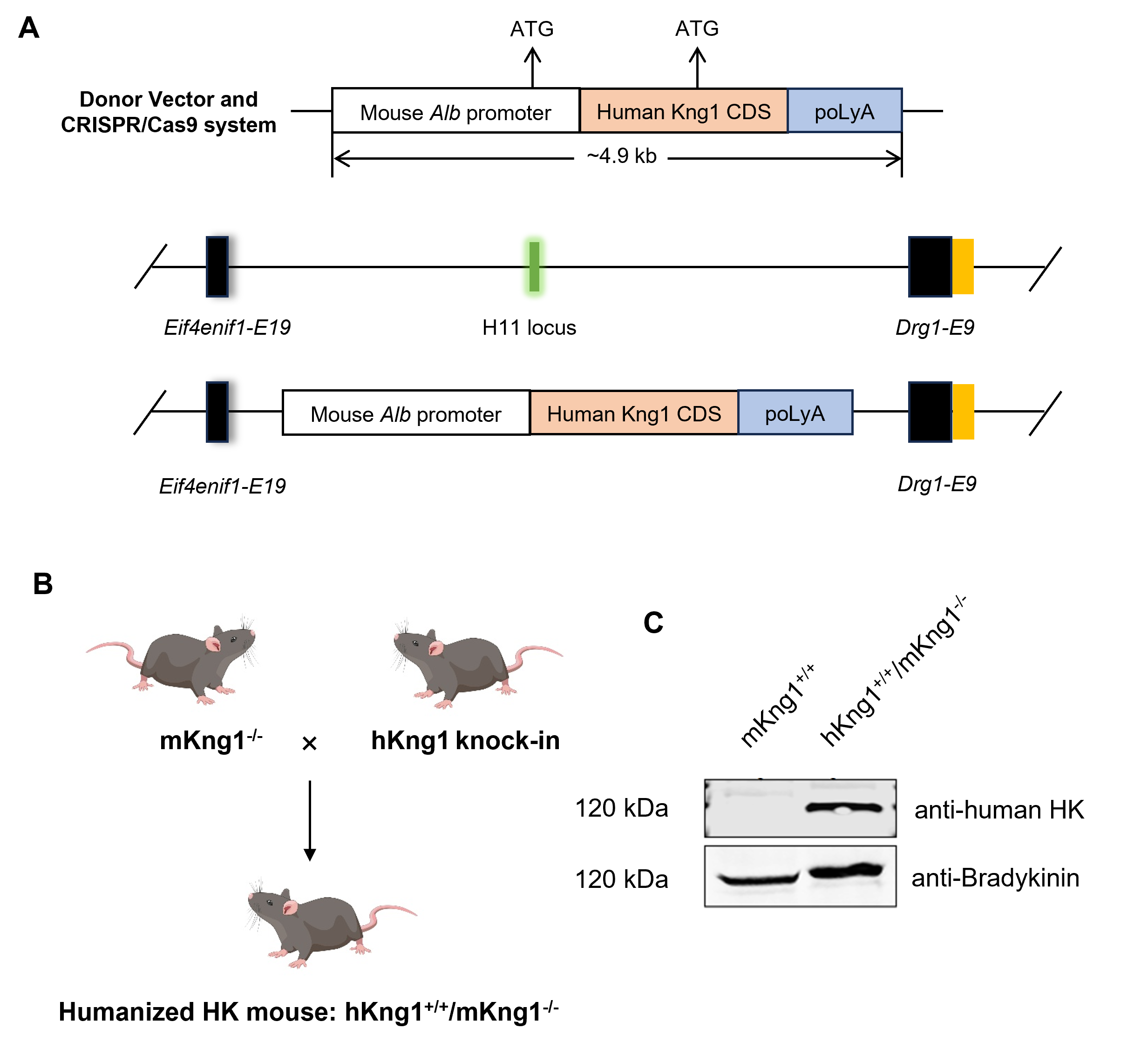 Abstract:This study aims to construct humanized HK mice and use GalNAc-HK-siRNA liver-targeted specific gene silencing technology to reduce plasma HK and fundamentally inhibit BK production, so as to investigate the effect of targeted inhibition of HK on reducing vascular permeability in HAE mouse models.CRISPR/Cas9 technology was used to construct human Kng1 knock-inmice; then, these mice were mated with mouse Kng1 knockout mice to obtain mice with only humanized Kng1. Subsequently, GalNAc-siRNA targeting HK (HK mRNA) was administered via subcutaneous injection to detect the effect of reducing plasma HK after administration. Two different vascular leakage mouse models induced by angiotensin inhibitors and mustard oil were applied to evaluate the role of HK gene silencing in alleviating vascular permeability.Humanized Kng1 mice exhibited a normal genetic phenotype. They also had normal FXIIa and PKa enzymatic activities. A single subcutaneous injection of GalNAc-HK-siRNA at a dose of 3 mg/kg resulted in a reduction of more than 70% in plasma human HK mRNA and over 95% in plasma human HK protein. In two different disease models of bradykinin-driven vascular leakage, administration of GalNAc-HK-siRNA led to a dose-dependent decrease in vascular permeability, indicating that RNAi-mediated reduction of plasma HK downregulates the production of BK and alleviates bradykinin-induced increase in vascular permeability. These results suggest that RNAi-mediated knockdown of HK by GalNAc-HK-siRNA is a potentially effective therapeutic approach for HAE.